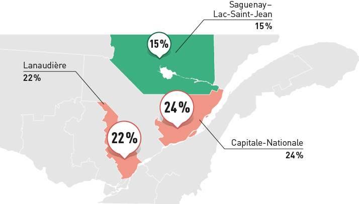 Principales régions productrices de pommes de terre, en superficie La pomme de terre est cultivée partout au Québec. Toutefois, trois régions se partagent plus de la moitié de la production: la Capitale-Nationale (24%), Lanaudière (22%) et le Saguenay-Lac-Saint-Jean (15%).