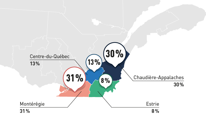 Les entreprises porcines sont réparties dans toutes les régions du Québec, mais elles se trouvent principalement en Montérégie (31%), Chaudière‑Appalaches (30%), dans le Centre-du-Québec (13%) et en Estrie (8%).
