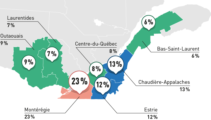 Les producteurs d’œufs de consommation se trouvent principalement en Montérégie (23%), en Chaudière-Appalaches (13 %), en Estrie (12 %), en Outaouais (9 %), dans le Centre-du-Québec (8%), dans les Laurentides (7%) et dans le Bas-Saint-Laurent (6%)