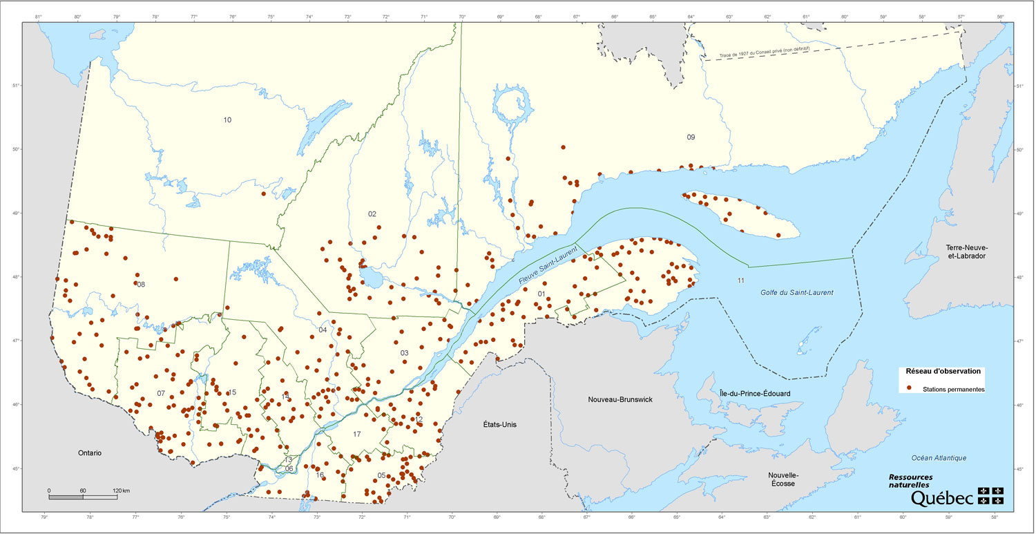 Le Québec s’est doté d’un système de détection et de suivi des populations de la tordeuse des bourgeons de l’épinette. Ce système repose sur un réseau de stations d’observation permanentes qui est complété, au besoin, par des stations ponctuelles. Consultez cette carte pour localiser leur emplacement (JPG 193 Ko).
