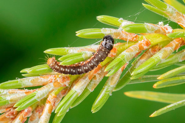 Dès que les nouvelles pousses se déploient, les chenilles y tissent une sorte d’abri formé de leurs déjections et de débris d’aiguilles entremêlés de fils de soie. Elles s’y nourrissent jusqu’à leur sixième et dernier stade larvaire, soit jusqu’à la fin de juin.