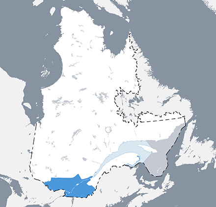 Carte de l’aire de répartition potentielle de la truite brune au Québec. © Ministère de l’Environnement, de la Lutte contre les changements climatiques, de la Faune et des Parcs