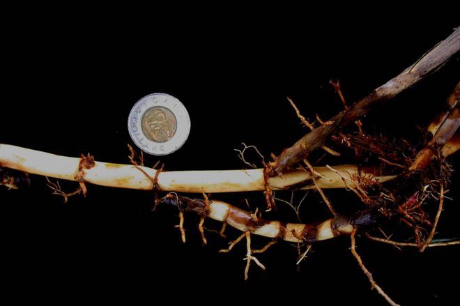 Tiges souterraines (rhizomes) de roseau commun. © Gilles Ayotte, 15-p.bot-phrag.commu-20, CC-BY-SA 4.0, Kalos, Bibliothèque de l’Université Laval