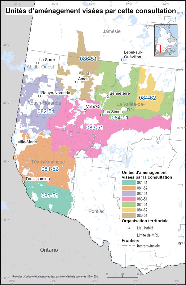 Les unités d’aménagement concernées par cette consultation sont : 081-51, 081-52, 082-51, 083-51, 084-51, 084-62 et 086-51.