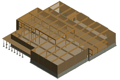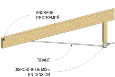 L’élément distinctif du projet réside dans l’intégration d’un système de poutres sous-tendues en bois prédimensionné. Ce système, inédit à l’échelle commerciale québécoise, combine cinq innovations : des tables de prédimensionnement adaptables aux portées usuelles des commerces (20 à 60pieds), des pièces et des connecteurs préfabriqués facilitant l’assemblage, un dispositif de mise en tension par élongation du poinçon central, des indicateurs de tension assurant la justesse du post-tensionnement et enfin, un assemblage suffisamment simple pour être exécuté par du personnel non expert et permettre ainsi de réduire le temps de chantier.