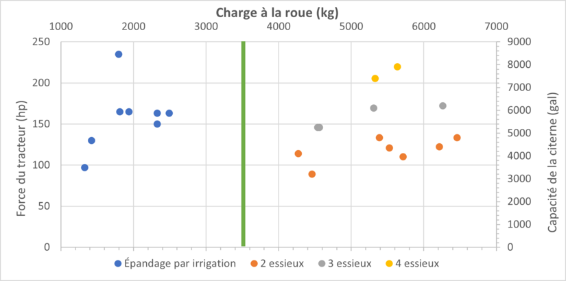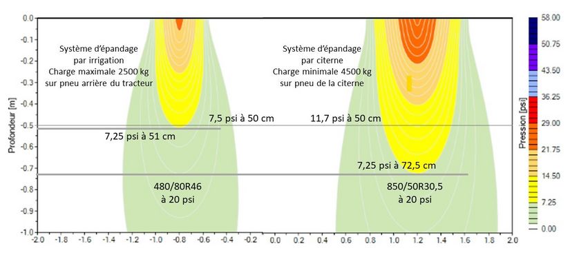 La charge à la roue est grandement diminuée avec l’utilisation d’un système d’épandage par irrigation. Elle passe d’une charge minimale de 4500 kg à la roue pour une citerne à une charge maximale de 2500 kg à la roue pour un système d’épandage par irrigation. Des charges allant jusqu’à 6500 kg à la roue ont été observées pour des citernes, ce qui est beaucoup plus élevé que la capacité portante du profil de sol.