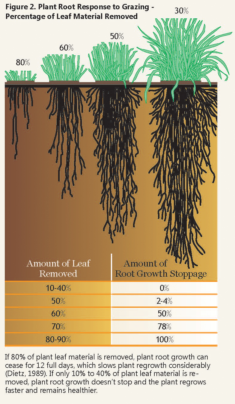 Dans la figure ci-dessous, on constate que si plus de 50 % des feuilles d’une plante fourragère sont enlevées, il y a un effet négatif sur la croissance des racines. Dès que 60 % des feuilles de la plante sont prélevées, il y a une réduction de 50 % de la croissance racinaire. Lorsque 80 % des feuilles de la plante sont prélevées, la croissance des racines s’arrête pour une période de