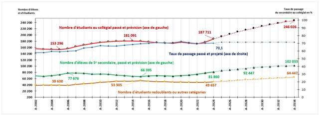 Chez les élèves finissant leur 5e année du secondaire à la FGJ, le taux de passage direct en 1re année du collégial était de 58 % en 2003. Il dépasse les 70 % depuis 2016, atteignant 72,4 % en 2020. Ce taux semble avoir atteint un plateau, se situant à 70,1 % en 2024. En ce qui concerne les prévisions collégiales, pour l’ensemble du réseau, cette composante sera maintenue à 71,3 %, par hypothèse, durant les années 2025 à 2034. Le taux de passage réellement appliqué sera, quant à lui, propre à chacun des centres de services scolaires (ou commissions scolaires anglophones).