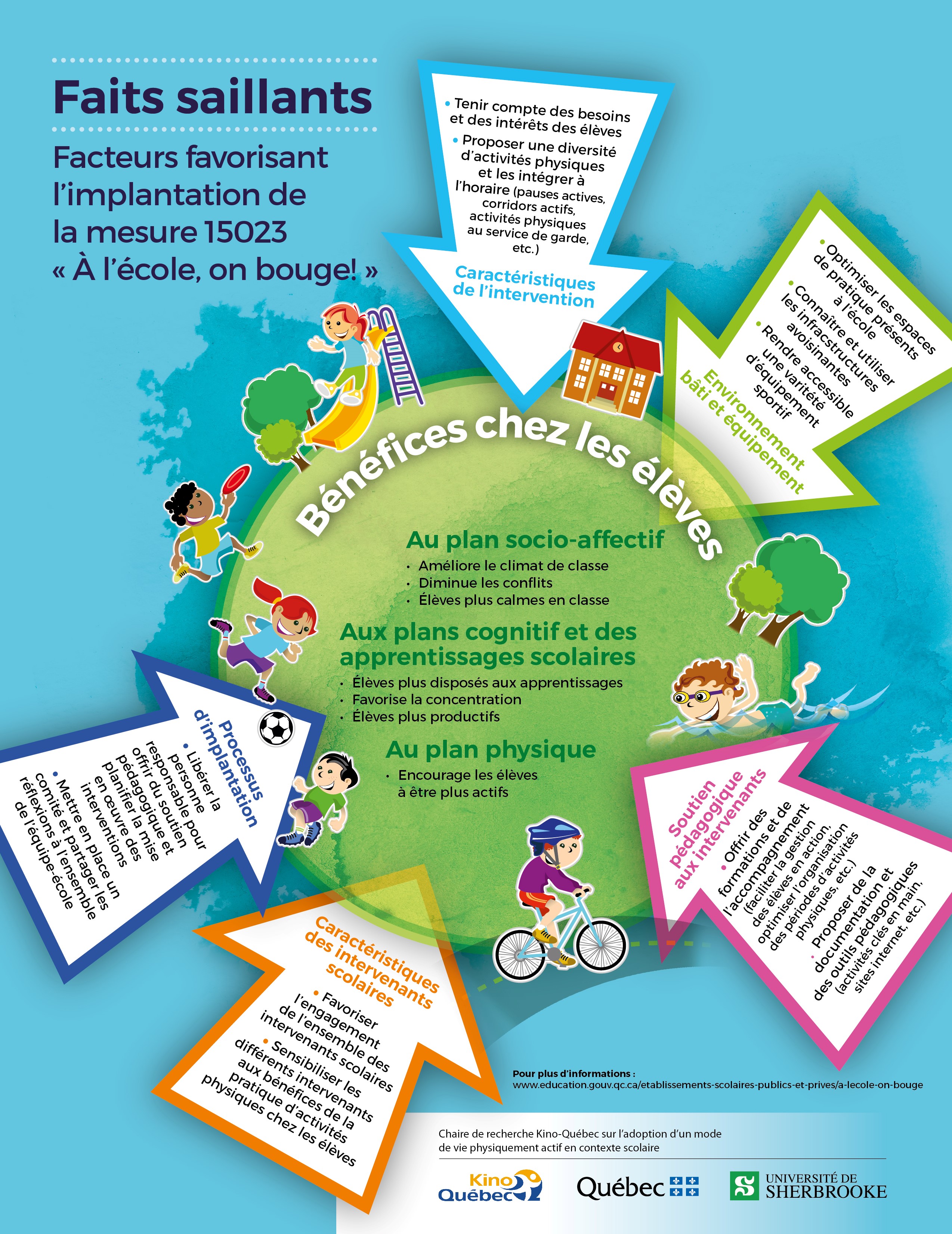 La mesure 15023 – À l’école, on bouge! (PDF 462 Ko) vise à soutenir les établissements d’éducation préscolaire et d’enseignement primaire afin d’augmenter et d’optimiser les occasions pour tous leurs élèves d’être physiquement actifs chaque jour d’école, leur permettant ainsi d’atteindre les recommandations en matière d’activité physique et d’en retirer un maximum de bénéfices. L’activité physique contribue notamment à augmenter la capacité d’attention et favorise la réussite éducative, le développement global et le bien-être des élèves.
