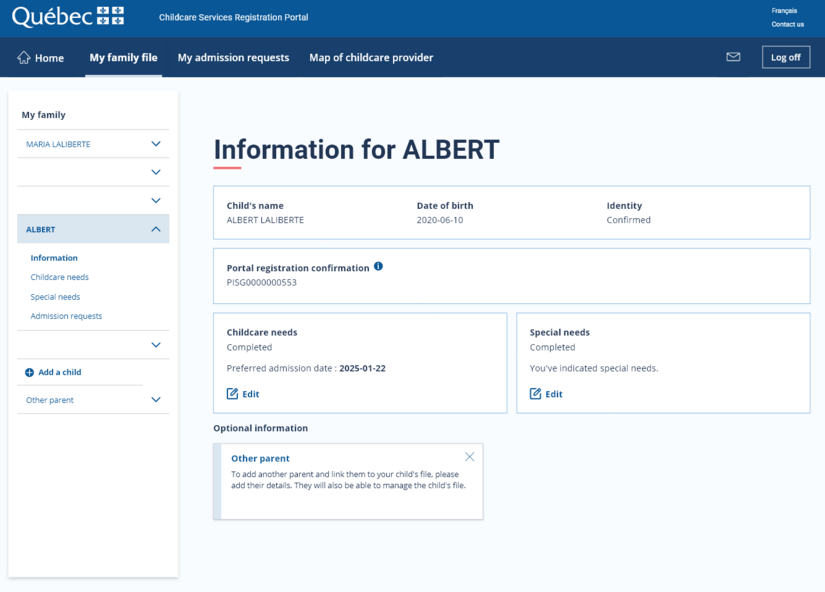 The new portal does not issue registration confirmation letters. However, if you obtain a space in a non-subsidized day care centre or a home educational childcare service, you may be asked to provide your child’s registration number. You can find this number in the portal, under your child’s name in the “Information” section of your family file.