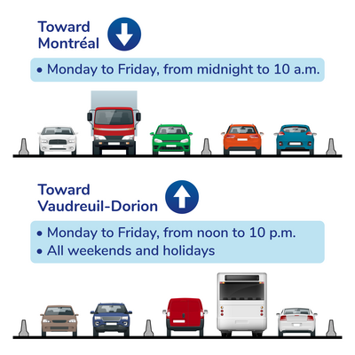- Toward Vaudreuil-Dorion, from noon to 10 p.m., weekdays, as well as all weekends and holidays.