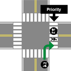 - If you want to turn right, you must first yield the right-of-way to pedestrians, cyclists and other MMA users crossing the roadway towards which you are heading.
