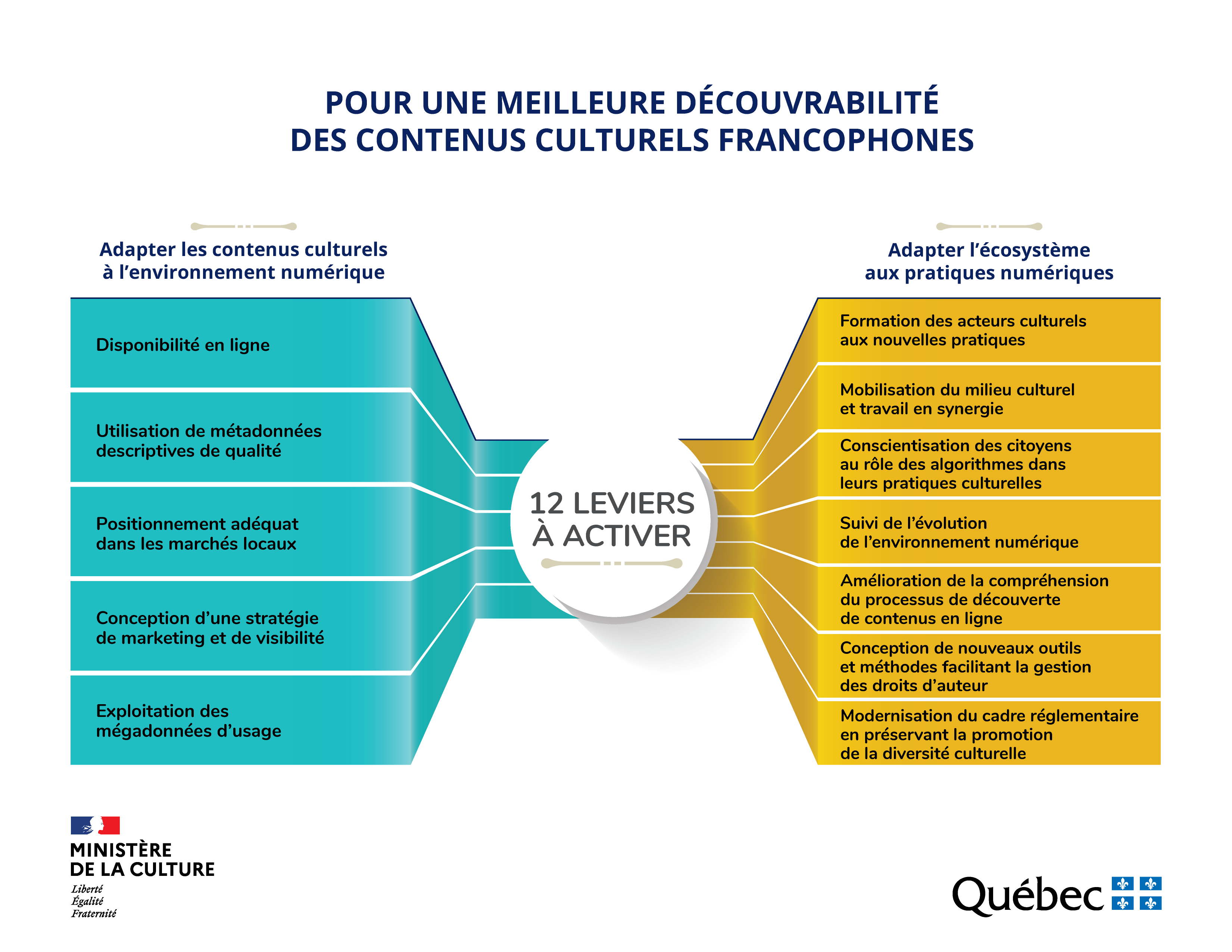 De ces travaux et entretiens, il en résulte un rapport proposant un portrait de la situation et une stratégie commune entre la France et le Québec pour améliorer la découvrabilité des contenus culturels francophones. De plus, un schéma a été élaboré afin de synthétiser les leviers sur lesquels repose l’activation de la découvrabilité des contenus culturels dans l’environnement numérique.