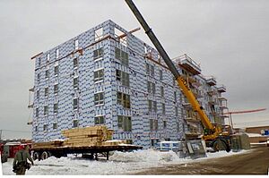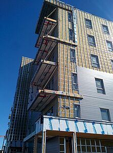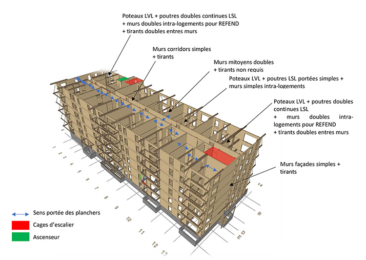 Bien que ce système constructif soit largement répandu pour les habitations de quatre étages et moins, l’ajout de deux niveaux (permis par la réglementation depuis 2014) comporte quelques particularités. Les principales concernent la structure, qui doit composer avec de plus grandes charges gravitaires et latérales, et les caractéristiques additionnelles de sécurité incendie.