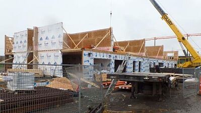 L’érection de la structure de six niveaux sur le site s’est effectuée en moins de douze semaines. Les professionnels responsables de la surveillance de chantier s’accordent pour dire que la rapidité d’assemblage des composants préfabriqués accroît le besoin d’une bonne communication auprès de l’entrepreneur et des ouvriers. Les nombreuses reprises de travaux suggèrent qu’il aurait été important d’avoir davantage d’échanges en début de chantier sur la nécessité de certains détails d’assemblage. À ce titre, puisque l’assemblage des revêtements des murs et planchers ainsi que celui des murs entre eux participent à la stabilité de la structure, le respect des spécifications de clouage et vissage est primordial (diamètre, longueur, assemblage, continuité). Une mauvaise compréhension de l’utilité de certains détails – qui peuvent différer de la construction plus courante de plus petites habitations – peut engendrer des non-conformités.