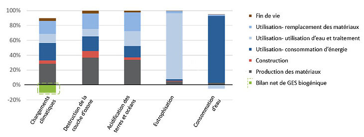 L’étape de la production des matériaux a une influence importante sur les indicateurs de changements climatiques, de destruction de la couche d’ozone et d’eutrophisation.