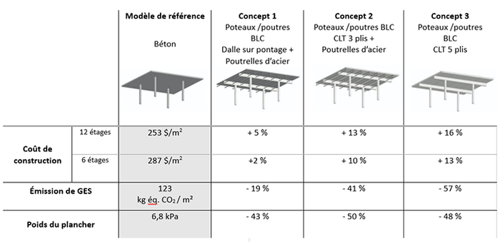 L’analyse comparative démontre que le coût du béton au Québec est très compétitif. Par rapport au modèle de référence, les systèmes incluant le bois sont plus coûteux, mais ils émettent considérablement moins de GES et réduisent significativement le poids de la structure.