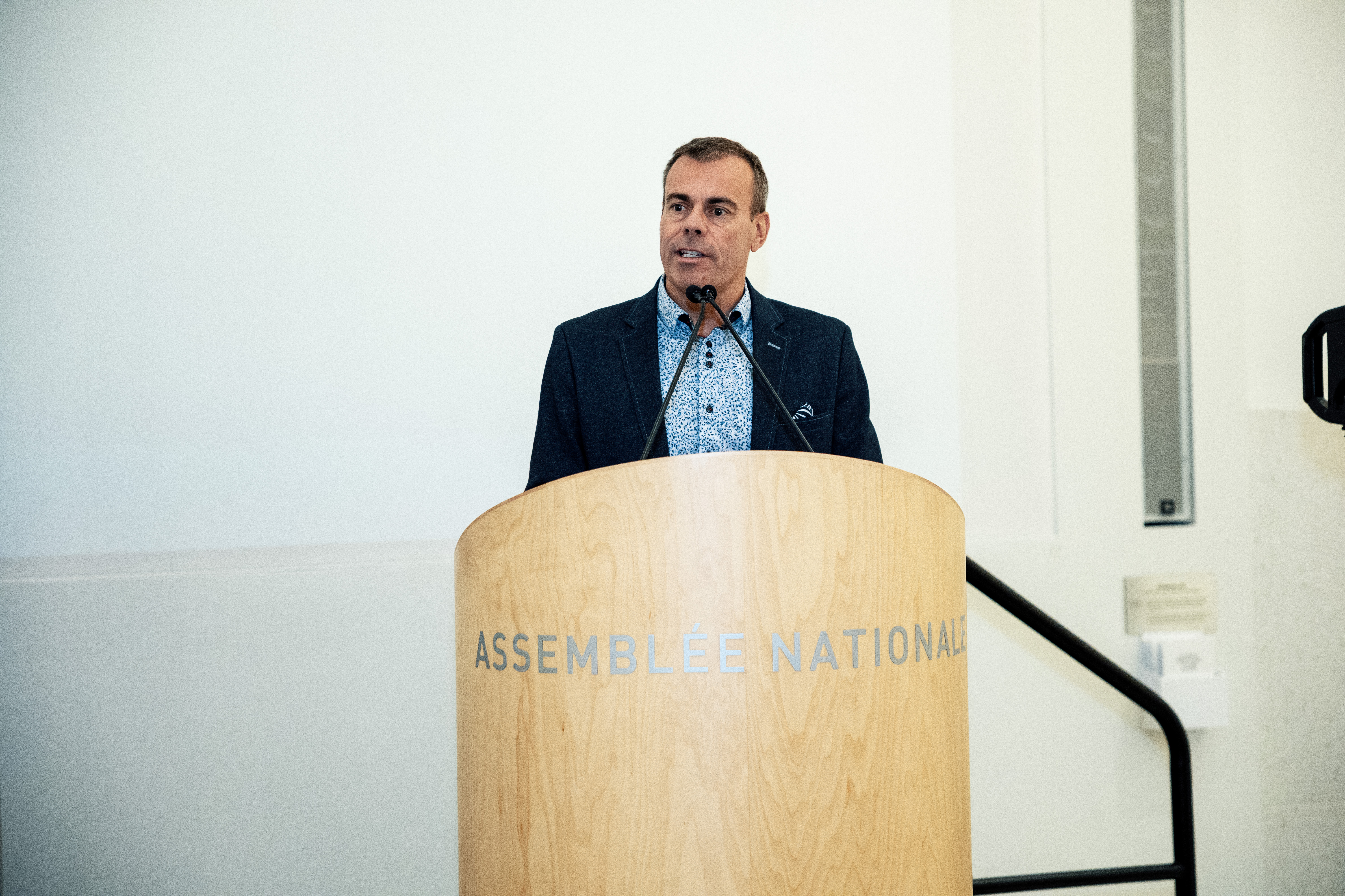 Pat Gravelle, vice-président de la Fédération Québécoise des Clubs Quads, Daniel Somers (lauréat motoneige Excellence), Réjean Caron (lauréat VTT Excellence), Jonatan Julien, ministre des Transports et de la Mobilité durable, Sébastien Schneeberger, député de Drummond–Bois-Francs et Normand Béchard, président de la Fédération des clubs de motoneigistes du Québec.
