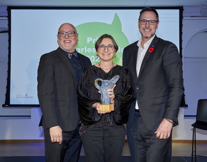 Michel Vallée, directeur général, Culture pour tous ; Maria Ezcurra, lauréate du Volet régional ; Jean-François Roberge, ministre de l’Immigration, de la Francisation et de l’Intégration, ministre de la Langue française, et ministre responsable des Relations canadiennes et de la Francophonie canadienne