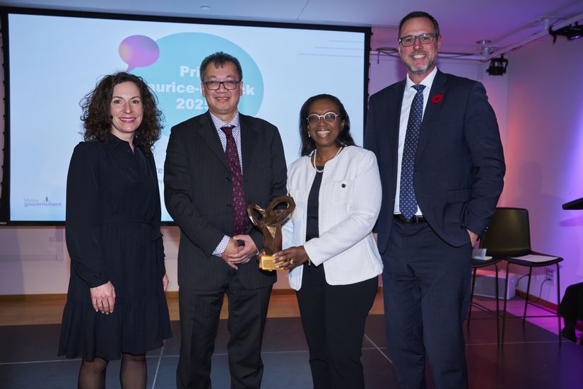 Véronique Proulx, présidente-directrice générale, FCCQ ; Guillaume Pham, directeur général, et Indira Moudi, présidente, Viandes Lafrance, entreprise lauréate du volet petites et moyennes entreprises ; Jean-François Roberge, ministre de l’Immigration, de la Francisation et de l’Intégration, ministre de la Langue française et ministre responsable des Relations canadiennes et de la Francophonie canadienne. (Crédit photo : Julien Faugère)