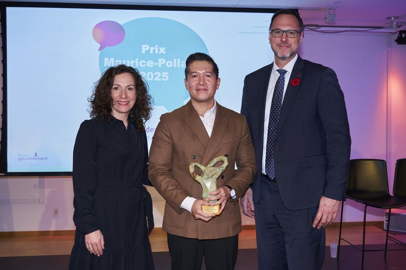 Véronique Proulx, présidente-directrice générale, FCCQ ; Joseph Nguyen, vice-président, Juridique — Affaires juridiques, L’Oréal Canada, entreprise lauréate du volet grandes entreprises ; Jean-François Roberge, ministre de l’Immigration, de la Francisation et de l’Intégration, ministre de la Langue française et ministre responsable des Relations canadiennes et de la Francophonie canadienne. (Crédit photo : Julien Faugère)