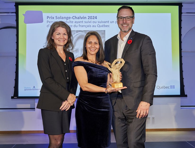 Karine Dumont, sous-ministre de l’Immigration, de la Francisation et de l’Intégration ; Jenniffer Marin, lauréate de la catégorie Personne adulte ayant suivi ou suivant un parcours d’apprentissage du français au Québec ; Jean-François Roberge, ministre de l’Immigration, de la Francisation, et de l’Intégration, ministre de la Langue française, et ministre responsable des Relations canadiennes et de la Francophonie canadienne
