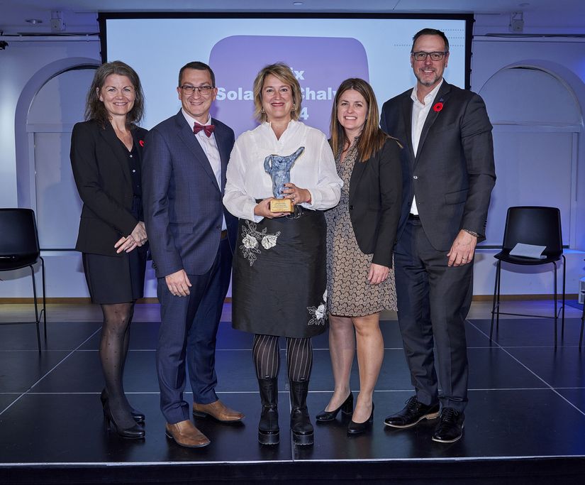 Karine Dumont, sous-ministre de l’Immigration, de la Francisation et de l’Intégration ; Sophie Desrochers, responsable de la francisation, Marie-Breton Champigny, chargée de projet et formatrice, Nawel Amokrane, directrice générale, Christian Lavoie, président du conseil d’administration du Centre d’éducation populaire de l’Estrie, lauréat de la catégorie Partenaires du MIFI en apprentissage du français : Organisme à but non lucratif ; Jean-François Roberge, ministre de l’Immigration, de la Francisation, et de l’Intégration, ministre de la Langue française, et ministre responsable des Relations canadiennes et de la Francophonie canadienne
