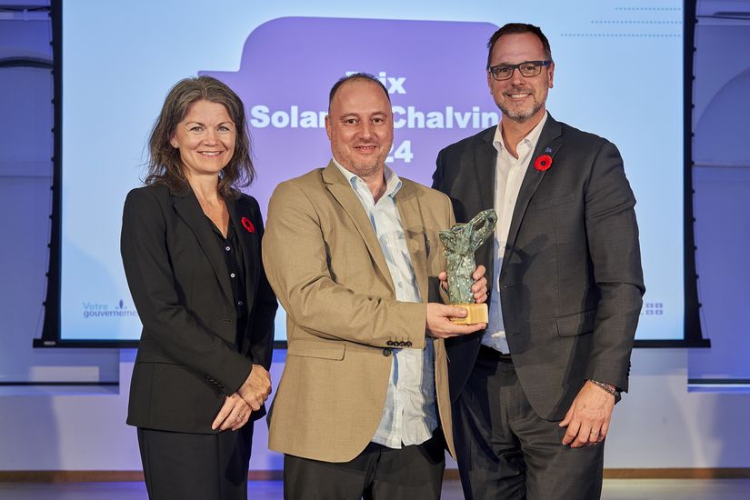 Karine Dumont, sous-ministre de l’Immigration, de la Francisation et de l’Intégration; Alexandre Godbout, lauréat de la catégorie Personnel enseignant du MIFI ; Jean-François Roberge, ministre de l’Immigration, de la Francisation, et de l’Intégration, ministre de la Langue française, et ministre responsable des Relations canadiennes et de la Francophonie canadienne