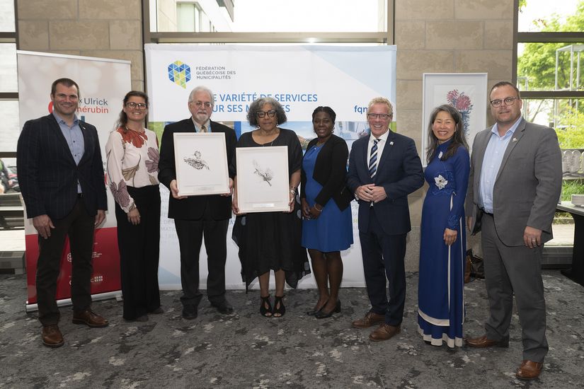 De gauche à droite : Antoine Tardif – maire de Victoriaville et membre du jury du prix Ulrick-Chérubin; Nathalie Groleau – directrice générale de la MRC de Mékinac; Bernard Thompson – maire d’Hérouxville et préfet de la MRC de Mékinac; Marjorie VilleFranche – directrice générale de La Maison d’Haïti; Peggy Larose – coordonnatrice Accueil et intégration à La Maison d’Haïti; Jean Boulet – ministre du Travail, de l’Emploi et de la Solidarité sociale et ministre de l’Immigration, de la Francisation et de l’Intégration; Kim Thuy – présidente d’honneur du prix Ulrick-Chérubin; Jonathan Lapierre – maire des Îles-de-la-Madeleine, président de la Communauté maritime et premier vice-président de la FQM