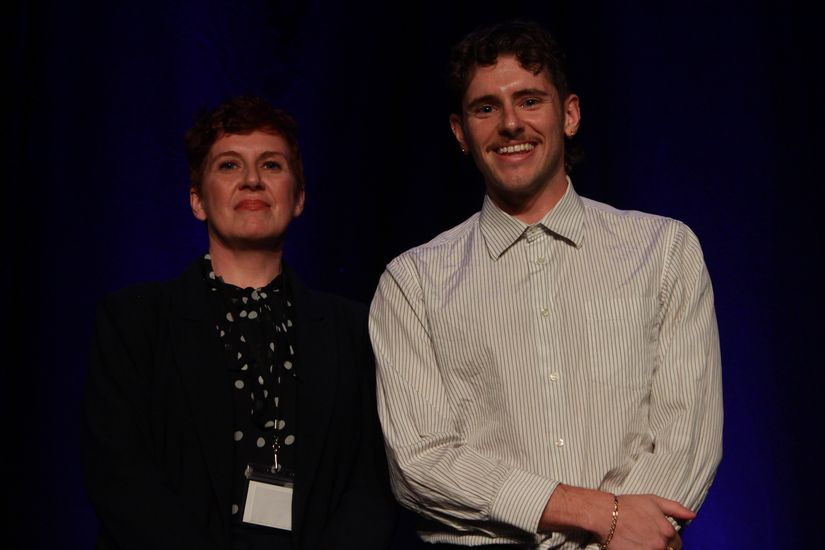 De gauche à droite, madame Sandrine Béliveau, directrice générale adjointe de la modernisation et de la performance correctionnelle au sous‑ministériat des Services correctionnels et M. Mavrick Langlois (photo prise lors de la remise du Prix, en octobre 2025).