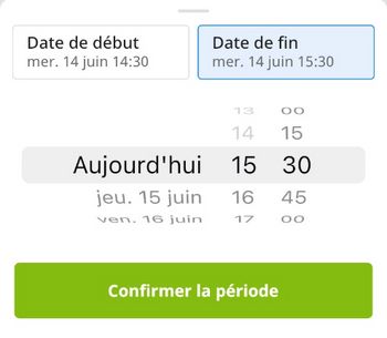 Inscrivez la période désirée (date de début et date de fin) d’utilisation du véhicule et appuyez sur « Confirmer la période » :