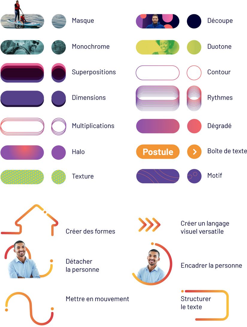 Tirés du point d’exclamation, qui traduit l’enthousiasme de notre message, le point et la ligne jouent le rôle de fil conducteur de nos communications. Ils évoquent le dynamisme et la détermination de notre personnel. Ils sont modulables et expressifs pour que vous puissiez donner vie à vos communications.
