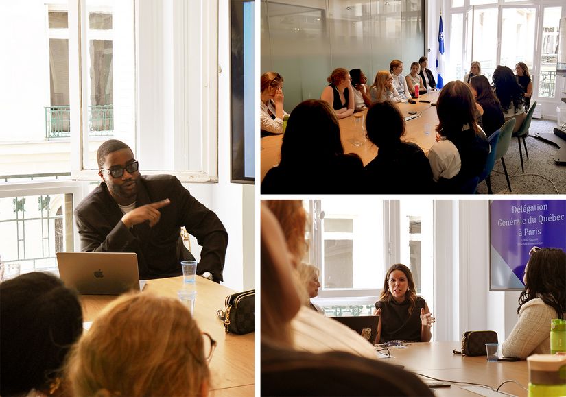 Près de 150 personnes parmi lesquelles la Déléguée générale du Québec à Paris, Michèle Boisvert, ont chaudement applaudi le travail d’Emeric Tchatchoua, fondateur et directeur artistique de la marque reconnaissable à son imprimé signature : des colombes de liberté en plein vol.