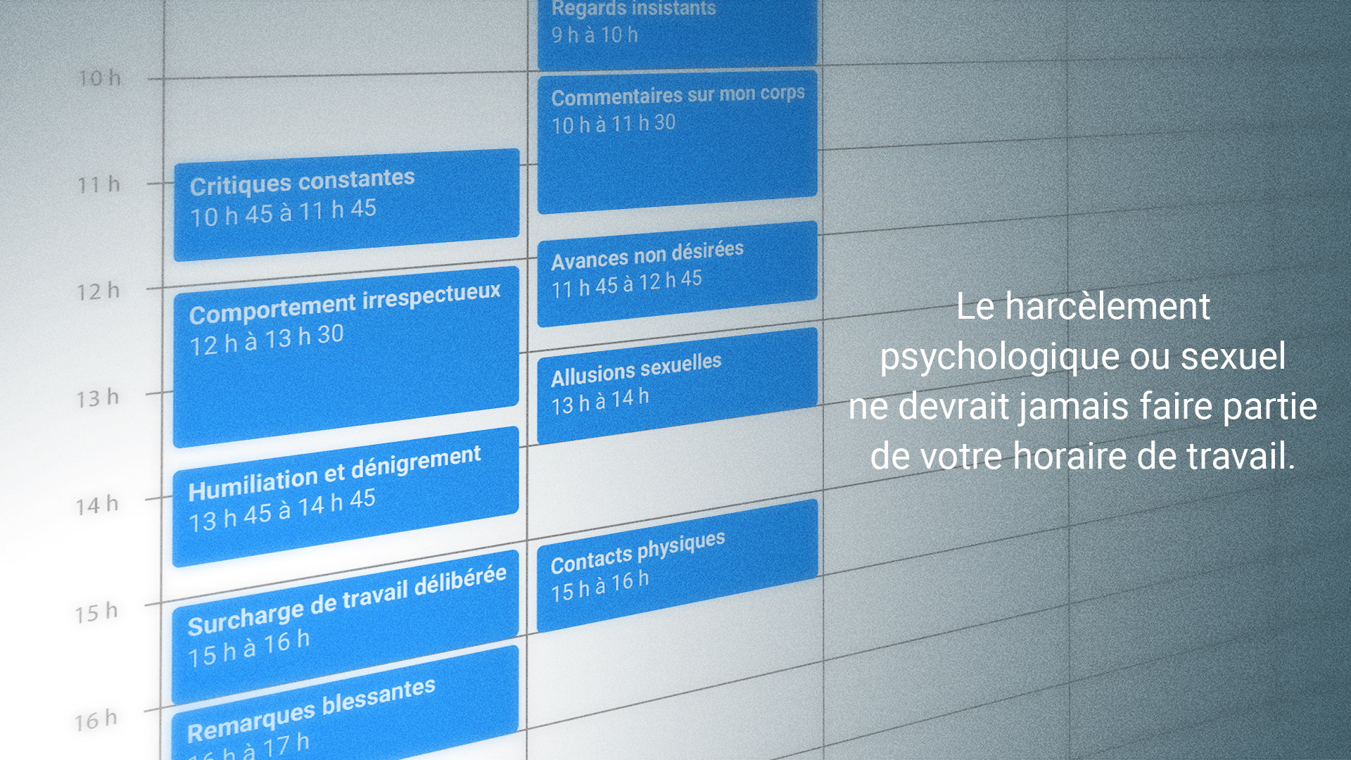 Sous le thème « Le harcèlement psychologique ou sexuel ne devrait jamais faire partie de votre horaire de travail », la campagne sera diffusée jusqu’au 6 octobre. Des messages publicitaires de 30 secondes en français et en anglais seront diffusés à la radio traditionnelle et numérique. S’ajouteront des publicités sur le Web et sur des plateformes sociales, ainsi que des articles dans différents médias.