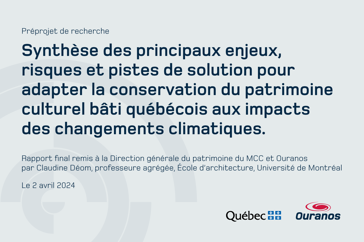Avec la mise en ligne de ce document, le Ministère souhaite contribuer à élargir les connaissances sur les risques de détérioration et de dommage du patrimoine bâti, une ressource non renouvelable, qu’occasionnent les phénomènes climatiques de plus en plus fréquents et intenses.