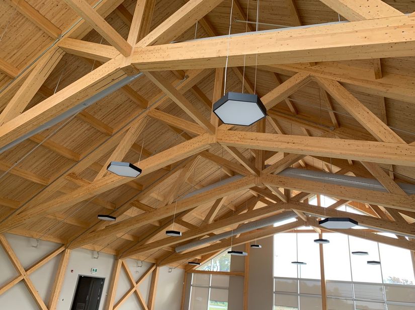 Comme les photos le montrent, le centre de services municipaux de Sainte‑Anne‑de‑Sorel a été construit en combinant une structure à ossature légère en bois, pour les murs et la toiture des bureaux, et une ossature en bois massif, pour les murs et la toiture de la salle communautaire.