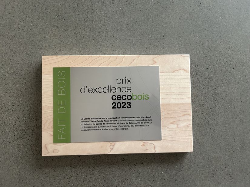 Le centre de services municipaux de Sainte-Anne-de-Sorel est un très bel exemple de construction d’un bâtiment municipal en bois. La Municipalité a d’ailleurs reçu un prix d’excellence CECOBOIS 2023, en reconnaissance de l’engagement municipal envers ce projet.