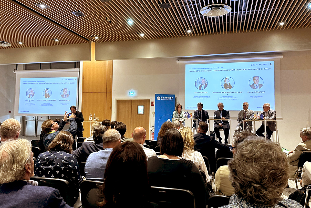 L’Émissaire aux changements climatiques et aux enjeux nordiques et arctiques, Jean Lemire, l’Innovateur en chef du Québec, Luc Sirois, le PDG de la Vallée de la Transition Énergétique, Alain Lemieux, et le recteur de l'Université de Sherbrooke, Pierre Cossette, ont présenté les politiques, stratégies et solutions déployées en faveur de l’innovation et de la transition énergétique au Québec, à une audience française et internationale.