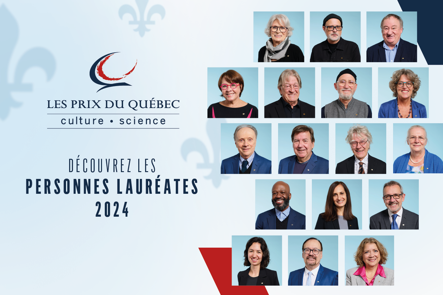Vibrant hommage à l'excellence et à la créativité, les Prix du Québec constituent la plus haute distinction décernée par le gouvernement du Québec dans les domaines de la culture et de la science. Ils reconnaissent le parcours exceptionnel de personnes ayant contribué à l’essor de leur domaine, à la transmission de la connaissance et au rayonnement du Québec à travers le monde.