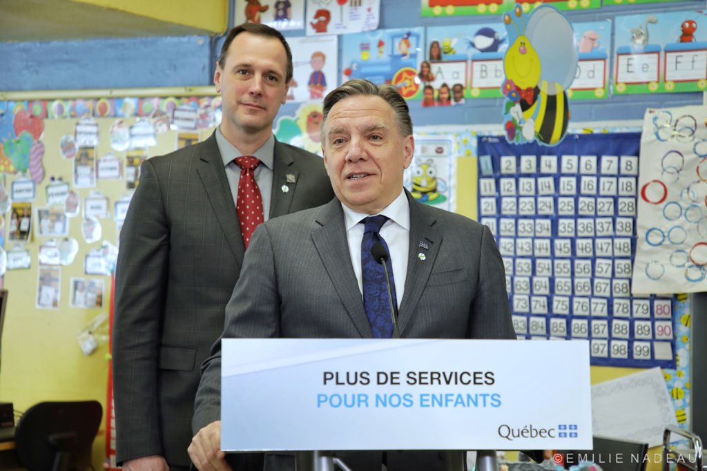 Québec, le 14 février 2019. ― Le premier ministre du Québec, M. François Legault, ainsi que le ministre de l’Éducation et de l’Enseignement supérieur, M. Jean-François Roberge, ont tenu un point de presse jeudi, afin de dévoiler les détails du projet de loi no 5 modifiant la Loi sur l’instruction publique et d’autres dispositions à l’égard des services de l’éducation préscolaire destinés aux élèves âgés de 4 ans. Ce projet de loi constitue un premier pas vers le déploiement, partout au Québec, de classes de maternelle non obligatoires pour les enfants de 4 ans.