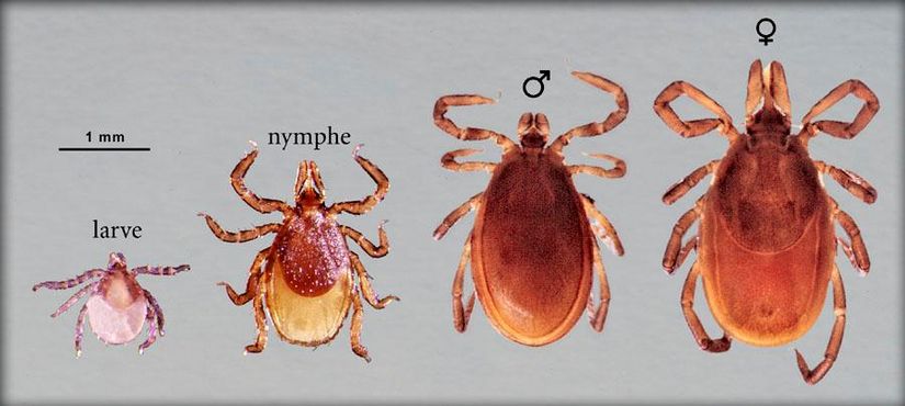 Les tiques ont trois stades de développement : larve, nymphe et adulte. À chacun de ces stades, la tique doit se nourrir du sang des animaux ou des humains pour passer au stade suivant. Ainsi, elles tentent de s’accrocher aux hôtes potentiels à leur portée.