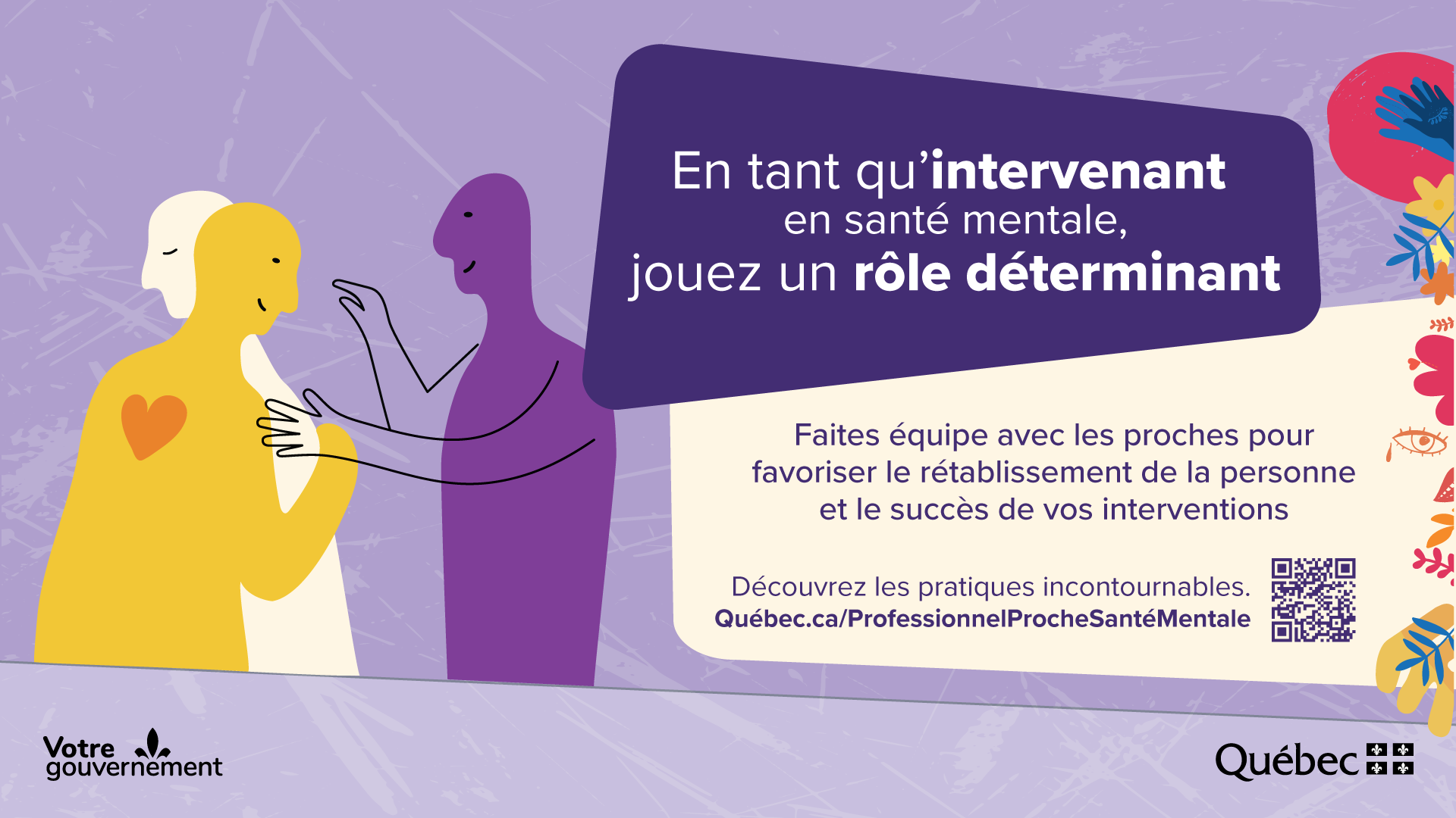 - Image-écran « En tant qu’intervenant en santé mentale, jouez un rôle déterminant - Faites équipe avec les proches pour favoriser le rétablissement de la personne et le succès de vos interventions » (PNG 357 Ko)