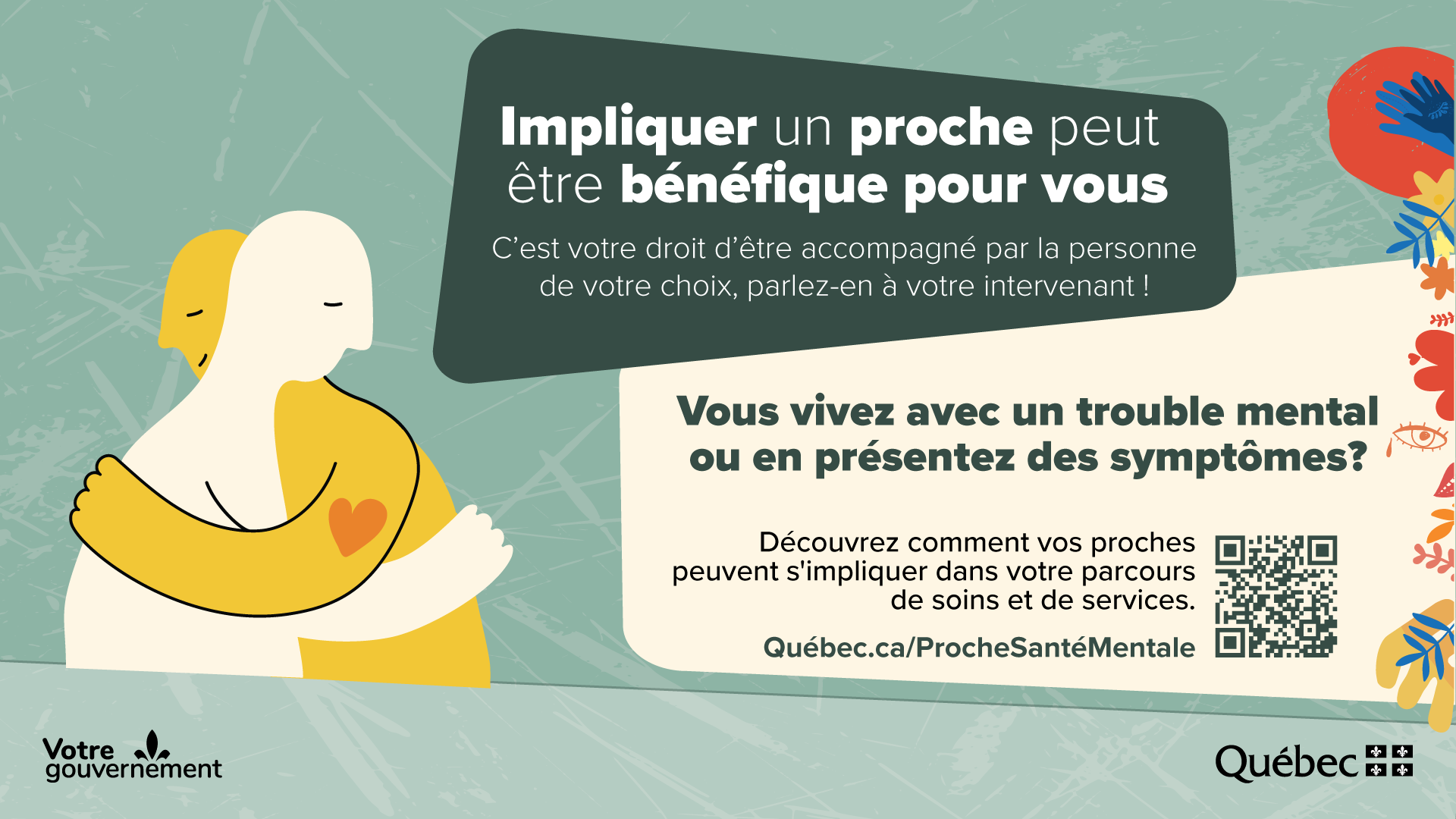 - Image-écran « Impliquer un proche peut être bénéfique pour vous - C’est votre droit d’être accompagné par la personne de votre choix, parlez-en à votre intervenant! » (PNG 384 Ko)
