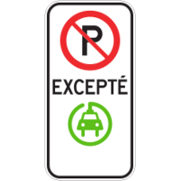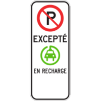 Ce panneau indique que le stationnement public est autorisé uniquement pour les véhicules électriques. Selon l’information inscrite sur le panneau, le véhicule électrique peut être en recharge ou non.