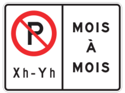Ce panneau indique certaines interdictions de stationnement qui s’appliquent uniquement durant la période hivernale. Il est installé à aux entrées des municipalités et, si requis, à tout autre endroit stratégique.