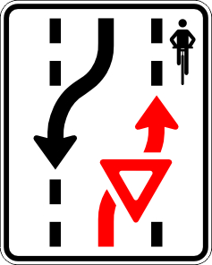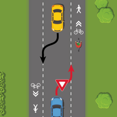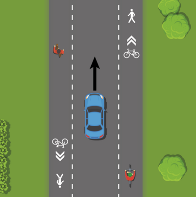 Lorsque deux véhicules routiers se croisent en présence de piétons ou de cyclistes, chacun d’eux doit ralentir et céder le passage au piéton ou au cycliste. Il peut ensuite empiéter sur la voie multifonctionnelle à sa droite et enfin revenir sur la voie centrale après le croisement.