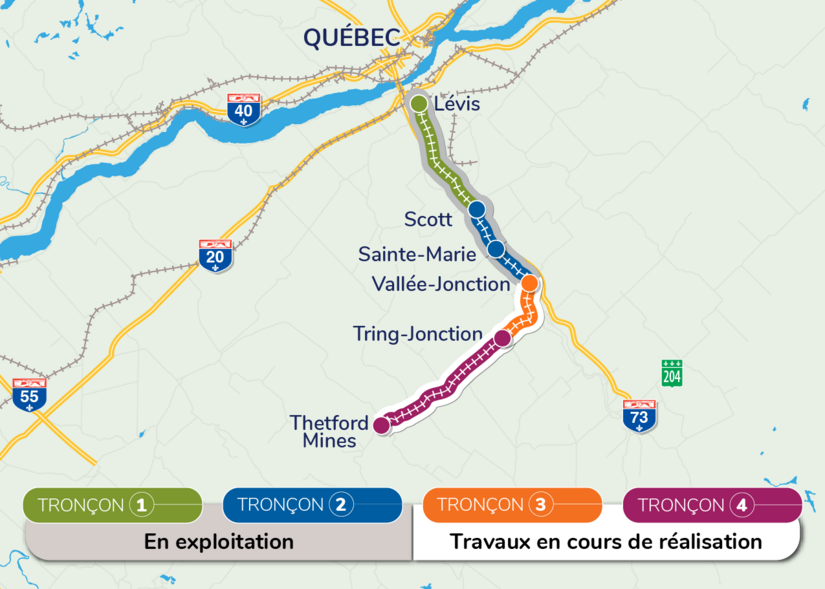 La réhabilitation du tronçon de 18 km entre Scott et Vallée-Jonction, qui comprend cinq ponts ferroviaires, s’est terminée à la fin 2025 et sa mise en exploitation est désormais possible.