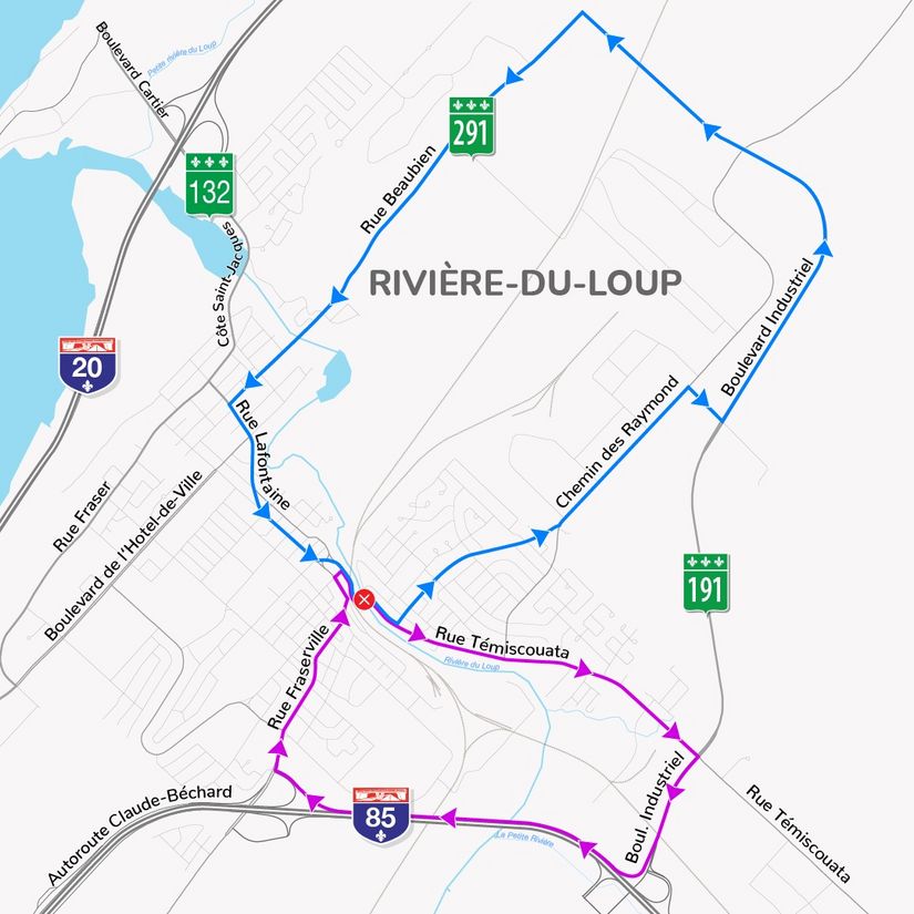 - un détour principal par la rue Témiscouata, la route 191 (boulevard Industriel), l’autoroute 85 et la rue Fraserville;