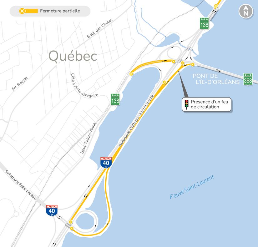 - Fermeture d’une voie sur trois de l’autoroute Félix-Leclerc (40) en direction est à l’approche de l’autoroute Dufferin-Montmorency (440) jusqu’à l’embranchement menant vers le pont de l’Île-d’Orléans.