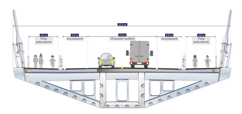 Le nouveau pont à haubans comprendra deux voies de circulation, soit une dans chaque direction, des accotements larges afin de maintenir la circulation en cas d’incident ou de travaux, une piste polyvalente de part et d’autre des voies de circulation, ainsi que des belvédères pour les adeptes du transport actif.